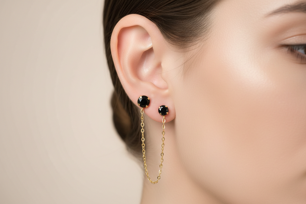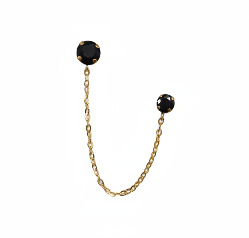 14K Gold Black Onyx Double Stud Chain Earring