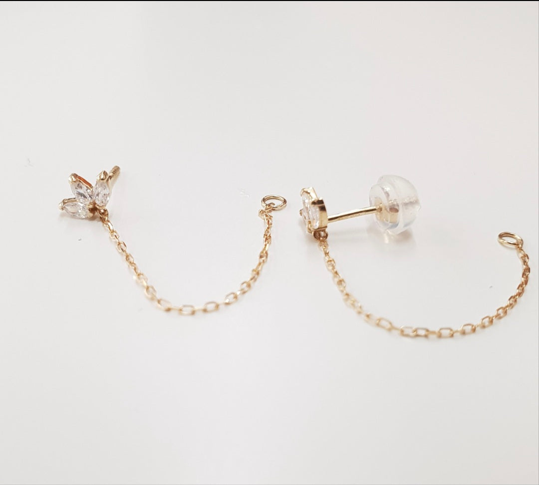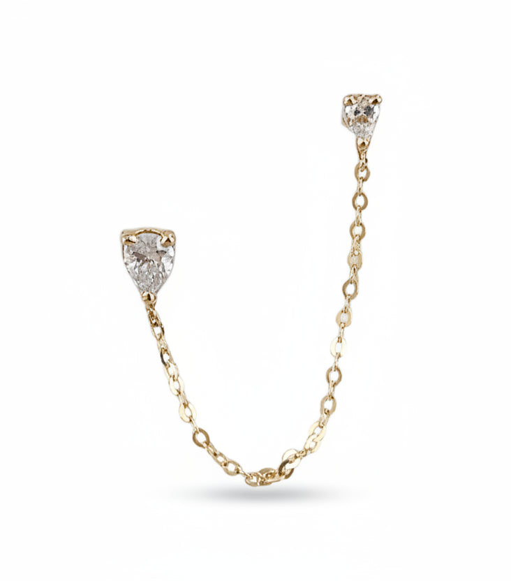 14K Gold Double Piercing Chain Earring with Pear Zirconia