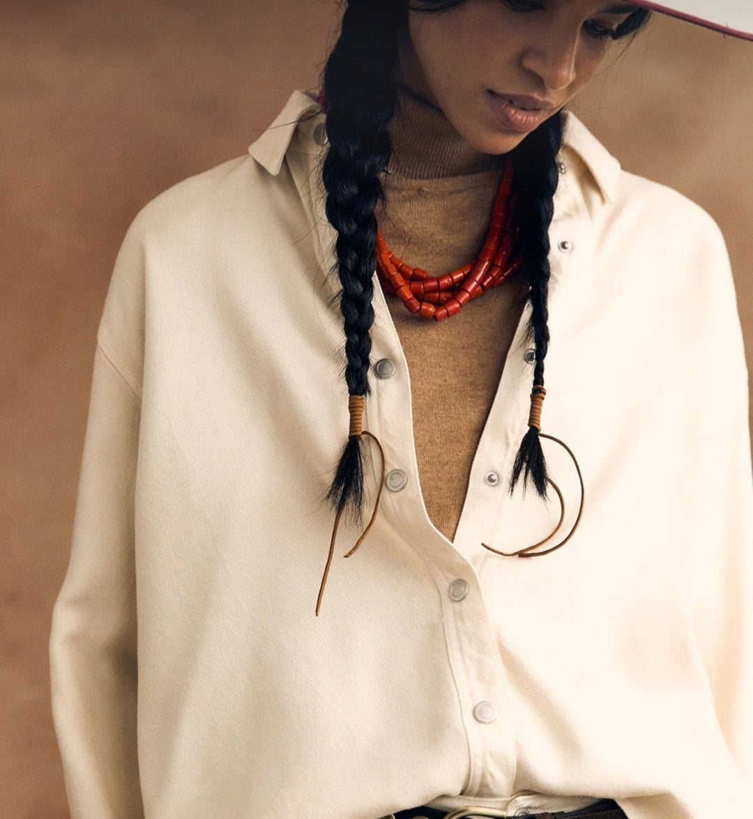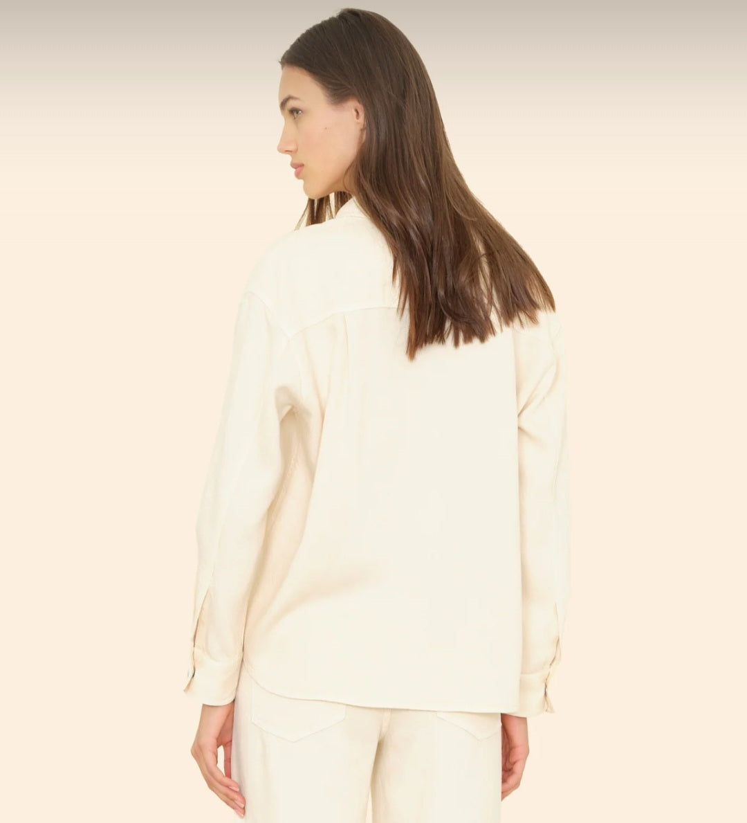 חולצה בגזרת אוברסייז עם כפתורי לחיצה ממתכת, צווארון פתוח, כתפיים שמוטות וחתך גב קלאסי.